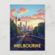 Capture the unique cityscape of Melbourne, Australia, with this charming retro travel postcard. The design features a train arriving at a sunny station, framed by lush parkland, with the distinct Melbourne Skyline and its prominent towers in the distance. This artwork perfectly blends the city's urban energy with its picturesque setting. Ideal for celebrating a visit to Victoria's capital, giving as a souvenir, or decorating your space with a piece of stylish, vintage-inspired Australian art.