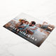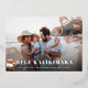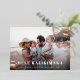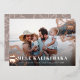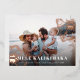 Chic holiday photo card features "Mele Kalikimaka," the Hawaiian Christmas greeting, in white lettering as an overlay on your favourite beach or vacation photo, with rose gold foil tropical hibiscus flowers peeking out at the corners.
