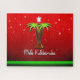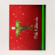 This design features a Hawaiian-themed Christmas image—twin Palm trees (instead of an evergreen) on a red background, with the words Mele Kalikimaka underneath. The basic colour scheme is red and green, with touches of white and brown.