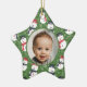 Baby's first Christmas photo ornament with a fun pattern with cute white mellow smiling snowmen in candy cane red and dark indigo blue hats and scarfs set on a bright Xmas green background with line drawn flowers and holly. The photo and "Brandon's Merry First Christmas!" text are fully customisable using the Zazzle template functions. This design is part of the Mellow Snowmen Xmas collection where you will find many matching snowman products like cards, stickers, gift wrap, ribbons, gift tags, pillows, custom stockings, and much more. There is also a Mellow Snowmen Christmas collection that uses the same snowmen pattern in trendy neutral terra cotta colours. The cute baby boy stock photo is by Christian Bowen on Unsplash. Merry Christmas!