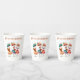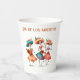 Make your celebrations uniquely yours with these vibrant paper cups featuring a delightful design of three dancing Catrinas, now with the option for customisable text! Above or below the cheerful artwork, you can add a name, a short message, or a date to personalise your partyware. Each skeletal figure is adorned with colourful floral hats and flowing dresses in hues of peach, teal, and red, bringing the spirit of Día de Muertos to your gatherings with a personal touch. One Catrina strums a guitar, another a small stringed instrument, while the third dances with lively energy, creating a scene of musical merriment that can now include your own special message.
