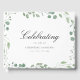 Customer specific, memorial, elegant, simpel "Celebrating the life of " handwriting font, white , euclayptus design funeral guest book.
