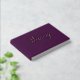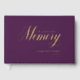 Customer specific, memorial, elegant, simpel "In Loving memory" gold-foil handwriting font, violet funeral guest book. Availible in gold, copper and silver foil.
