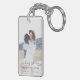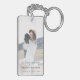 Modern, minimalist photo funeral favour keychain to celebrate the life of your loved one in a minimalist clean simple design style featuring an informal casual handwritten script font. The design can easily be personalised with your own photo and text to create a special tribute for your loved one's funeral, memorial or celebration of life. The image shown is for illustration purposes only to be replaced with your own photo. The placeholder image shows a young woman with wavy blonde hair wearing a hat and white sweater dress sitting on a gold vintage jeep in the mountains cuddling an adorable black dog. #funeral #favour #keychain #memorial