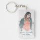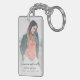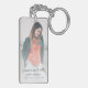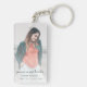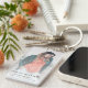 Modern, minimalist photo funeral memorial keychain to celebrate the life of your loved one in a minimalist clean simple design style featuring a handwritten script font. The design can easily be personalised with your own photo and text to create a special tribute for your loved one's funeral, memorial or celebration of life. The image shown is for illustration purposes only to be replaced with your own photo. The placeholder image shows a young woman with long wavy brown ombre hair wearing a leather jacket, orange lace top and white jeans. #memorial #keychain #favour