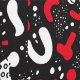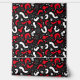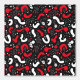 A dynamic and bold seamless pattern featuring Memphis-style abstract shapes in a striking colour combination of red and white against a deep black background. This contemporary design incorporates playful curved forms, dotted textures, and geometric elements reminiscent of 1980s postmodern design. Perfect for fashion accessories, modern interior decor, digital backgrounds, and trendy merchandise targeting style-conscious consumers who appreciate bold, contemporary aesthetics.