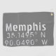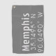 Modern typography design features Memphis longitude and latitude coordinates in distressed white font that runs lengthwise down the side on medium grey background