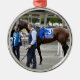 The European invader Mendelssohn, standing quietly in the paddock for the 100th running of the prestigious Jockey Club Gold Cup at beautiful Belmont park. Wearing the royal blue, #3 saddlecloth, Mendelssohn is being walked by his trainer and handler on each side in the paddock.
