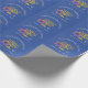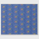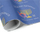 Stylish, elegant CHANUKAH BLESSINGS Wrapping Paper. Design shows a gold coloured MENORAH with multicolored STAR OF DAVID and silver grey DREIDEL. At the top there is curved text which says CHANUKAH BLESSINGS and underneath the text reads BARUCH ATAH, ADONAI (Blessed are You, O God) . The background colour is israeli blue. Matching items are available in the HANUKKAH Collection by Berean Designs.