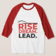 This t-shirt features a bold, two-tone design. The words "Rise Dream Lead" are stacked vertically in a clean, modern font. "Rise" and "Lead" are printed in a striking red, while "Dream" stands out in crisp black. The contrasting colours create a powerful and motivational statement.