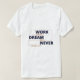 Get inspired daily with this "Work Hard Dream Big Never Give Up" t-shirt! This straightforward yet profound message is presented in a clear, modern font with eye-catching navy and orange accents, subtly outlined for emphasis. It's the ideal tee for anyone who believes in the power of effort and resilience. Comfortable enough for everyday wear, it serves as a constant reminder to stay focused on your aspirations and never lose sight of your potential. An excellent gift for friends, family, or yourself, this t-shirt is designed to inspire and encourage relentless pursuit of success.