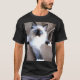 A sleek T-shirt design featuring a playful Siamese cat with piercing blue eyes, surrounded by minimalist geometric patterns and soft pastel colours, emphasizing elegance, charm, and feline grace.