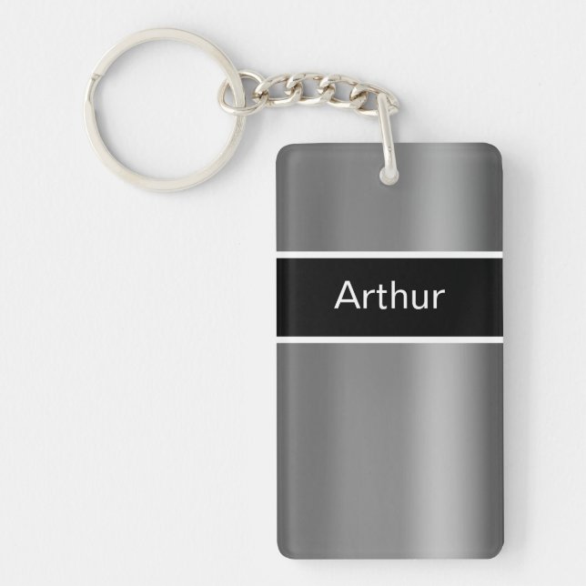 Mens monogram keychain with masculine monogram emblem you can personalise with any name, initials, or message and printed silver looking backdrop withbkack background colour you can customise if you want to. Designed as a personal gift or party favour as keychains for men or keychains for boys, in a fun two side acrylic design that lets you carry your keys in style.