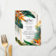 Presenting the Wedding Menu Card from the Birds of Paradise Bliss: Watercolor Wedding Suite, a captivating and personalised addition to elevate your wedding celebration. The front of the 4.5" x 6.25" card showcases a mesmerising composition of exotic birds of paradise flowers and leaves against a pristine white background, creating a visually stunning and blissful ambiance. The carefully curated wedding menu is tastefully presented, offering your guests a delightful preview of the culinary delights awaiting them.