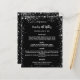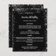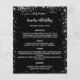 An elegant, glamourous menu. A black background, decorated with faux silver glitter, sparkles. White text. Personalise and add your name, dates and the menu.