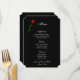 Menu Card shown on basic paper in black and with a single red rose print. At the bottom is the Bride and Groom's names and wedding date to commemorate your event. Script and standard text in white. Customise your names and menu items by clicking customise button, look to right and find appropriate boxes to change to your information. Wishing you best wishes for your Wedding Day.
