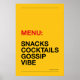 Brighten up your kitchen with humour! “MENU: SNACKS, COCKTAILS, GOSSIP & VIBES” poster in modern typography. Available in multiple colour backgrounds, perfect as home decor, gifts, or kitchen wall art.