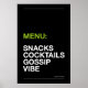 Brighten up your kitchen with humour! “MENU: SNACKS, COCKTAILS, GOSSIP & VIBES” poster in modern typography. Available in multiple colour backgrounds, perfect as home decor, gifts, or kitchen wall art.