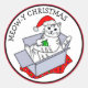 Cute cat pun Christmas stickers. Cute white cat with Santa hat on sitting in a cardboard box.