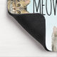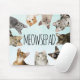 We will all sits on your meowse pad and wait for the mouse to come back. Comical cat mousepad with illustrations of siamese, bombay, scottish fold, and russian blue cats on a light blue background.
