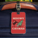 Retro style illustration with "Meowy Catmas" text design and cute black cat, Christmas tree, snowflakes, gifts, paws and stars decoration