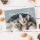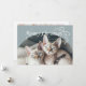 Cute Christmas Cat Photo template card featuring a funny text that says "Meowy Christmas." Add your cat pictures on this stone blue arch frame card. There is an illustration of a bow.