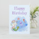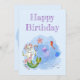 Happy Birthday card in light blue theme with an undersea illustration of a mercat with fishes, jellyfish, seahorse. On the back of the card is an illustration of a birthday cake and birthday gifts.