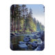 This photo features the smoothed out water of Merced River, boulders and pine forest, with El Capitan in distance, in Yosemite National Park.