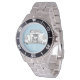 Has heft and feel of expensive stainless steel quartz watches. Good band with safety catch. I removed links, which is easy because engraved arrows show direction to push the linking pins. As always by this seller, the image (a railroad logo) is a perfect reproduction of my emailed image, and is precisely spaced and aligned.