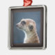 This cute and playful meerkat would love a place right on your Christmas tree. Meerkats are native to deserts and grasslands. Their bushy, brown-striped fur, small, pointed faces, and large eyes give them a distinctive look. The image is surrounded with a taupish brown, and framed in silver coloured metal. The back is all metal.