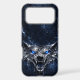 A fierce and sophisticated phone case featuring a snarling wolf head, expertly "forged" from shimmering liquid mercury. The deep blue sapphire eyes provide a stunning contrast against the dark, cracked glacial ice background. Designed for the modern flagship phone with a bottom-weighted layout to ensure the artwork remains clear of all camera lenses.