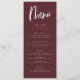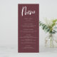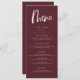 Modern minimalist wedding dinner menu card featuring boho script font. The background colour is in merlot red with white texts.