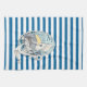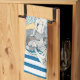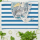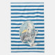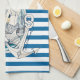 Bright blue and white horizontal pattern design kitchen towel features a nautical ocean theme with a mermaid and silver anchor!