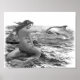 Black and white illustration of a young mermaid sitting on a rock watching a dolphin play in the ocean.