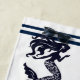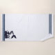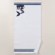 This beach towel is shown in a white colour with a mermaid print and striped accents in a navy blue colour.