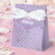 Lavender purple mermaid theme party favour boxes for birthday party or other special occasions. Allover printed, faux metallic silver mermaid scales effect on girly pastel purple coloured background. Front reads 'Birthday' in elegant, white lettering with personalised name above. Festive, bright party favours for nautical party themes, girls mermaid birthdays, pool party, beach party, summer event, under the sea theme, and purple party colours. We have this mermaid favour box design in many different colours to mix and match for your celebration, as well as coordinating mermaid party invitations and nautical party decor in our Zazzle.com/angela65* shop.