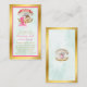 Sleeping baby mermaid in a gold clam shell surrounded by pearls. Pink tail fin and gold & pink tiara. Banner on shell reads "Precious". Mint background.
