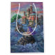 If you love mermaids, then this painting is for you. Mermaid Castle painted by Traci Van Wagoner features a mermaid with purple hair in front and a mermaid with green hair sunning herself on rock islands while another mermaid with pink hair swims in the ocean in front of a castle with a purple, orange and yellow sunset sky behind. This beautiful and whimsical fantasy art makes a great gift and a stunning decoration for your office or home.