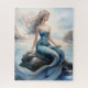 Jigsaw puzzle of a serene mermaid with long flowing hair sitting gracefully on a rock surrounded by calm ocean waters and distant cliffs. Soft pastel colours enhance the tranquil and magical atmosphere of the scene.
