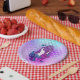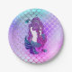 Paper party plates with image of mermaid in colours of blue, gold and purple.