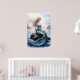Poster of a serene mermaid with long flowing hair sitting gracefully on a rock surrounded by calm ocean waters and distant cliffs. Soft pastel colours enhance the tranquil and magical atmosphere of the scene.