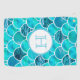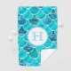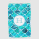 Aquamarine, mint green and turquoise coloured girly mermaid scale pattern. The scales are watercolor painted and some filled with sea water as contrast. A white and blue sircle with your monogram letter in light blue.
