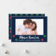 Merrier than ever! New baby photo with red and green snowflakes against a dark navy blue background. Photo template via Pixabay licensed under CC0 and must be replaced with your own photo
