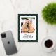 Send a stylish greeting with this foil holiday card featuring an emerald green and black buffalo plaid background and a modern polaroid style photo frame. “Merriest” shines in gold foil script above bold Christmas typography for a clean, contemporary look. Personalize with your family name and year. Backside includes a second photo and short holiday message.