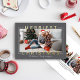 "Merriest Christmas" holiday card features a horizontal format with landscape photo and modern real gold foil greeting text that frames and overlaps the picture. Personalise the simple script text with a family signature and the year, and choose to include an additional message on the back of the card. Two additional photo spaces are also included on the back. Includes a dark charcoal grey background colour.