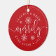 Personalise this festive red holiday ornament with your names and the year for a chic way to commemorate your first married Christmas! Perfect for newlyweds, round ornament features "merrily ever after" in a mix of white calligraphy script and block typefaces, accented with white snowflakes. Add your favourite wedding photo to the reverse side.