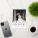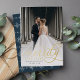 Elegant holiday photo cards for newlyweds feature a favourite vertical or portrait orientated wedding photo with "Merrily Ever After" overlaid in rich gold foil calligraphy script. Personalise with your names or custom greeting beneath. A subtle and modern snowflake pattern on the reverse side completes the look. Perfect for sharing a wedding photo for your first married Christmas.