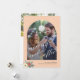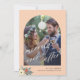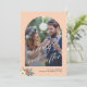 Modern typography script merrily ever after photo orange apricot wedding announcement holiday card with arch photo, custom text, and a small Christmas seasonal watercolor botanical floral bouquet.