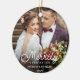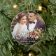 Personalised holiday photo ornament for newlyweds features a favourite wedding photo on each side, with "Merrily Ever After" overlaid in white calligraphy. Customise with your names and wedding date.