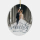 Elegant holiday photo ornament for newlyweds features a favourite wedding photo on each side, with "Merrily Ever After" overlaid in chic calligraphy script. Personalise with your names and wedding date on the back.